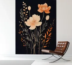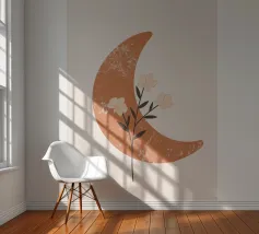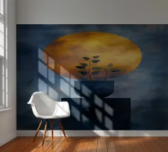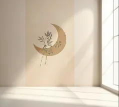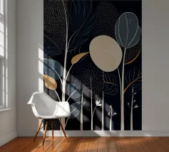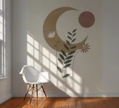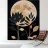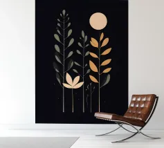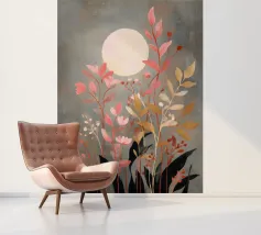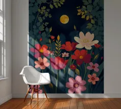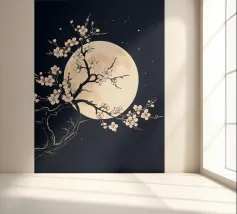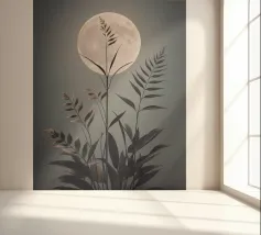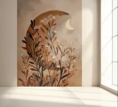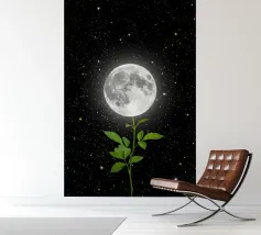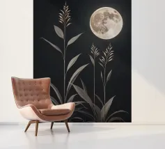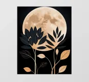 This captivating print features a full moon, bathed in a soft, golden glow, against a deep black backdrop. Two elegant, stylized flowers, one with dark, almost iridescent petals and the other with delicate, golden leaves, stand tall beneath the lunar orb. The interplay of light and dark, combined with the intricate details of the floral elements, creates a truly mesmerizing piece that will add a touch of celestial beauty to any space.