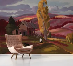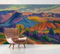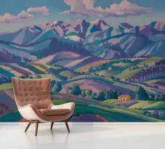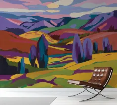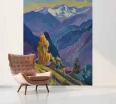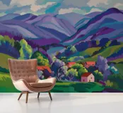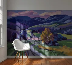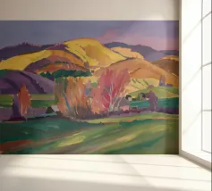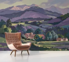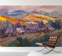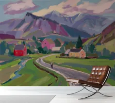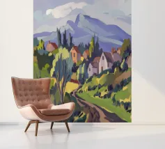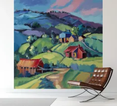 Een kleurrijk landschapsschilderij toont een dorp genesteld op een heuvel met levendige, patchwork-achtige velden in groene, blauwe en paarse tinten, met roodgedekte huizen onder een heldere hemel.