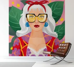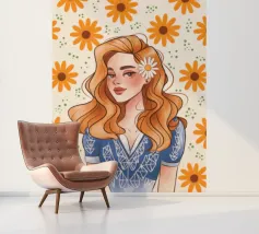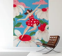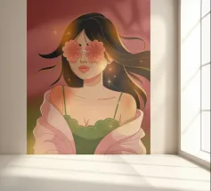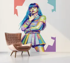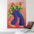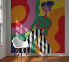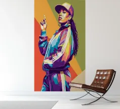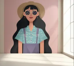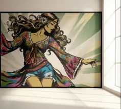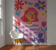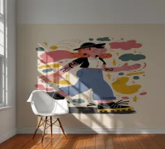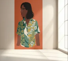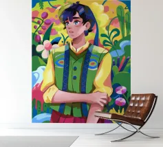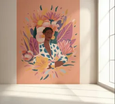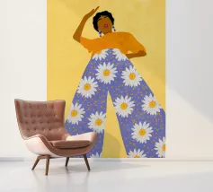 This artwork depicts a person in a vibrant yellow floral top and blue pants, striking a dynamic pose against a pink background with orange floral patterns.