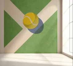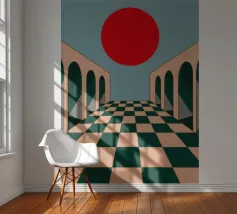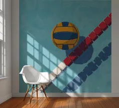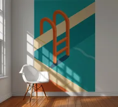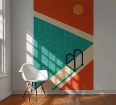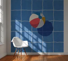A modern, abstract depiction of a swimming pool with green checkered tiles. A red ball floats on the water, creating a sense of a quiet, sun drenched moment of leisure.
