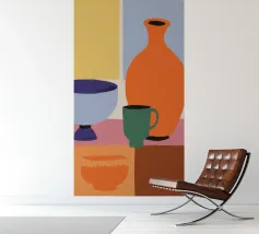 A vibrant still life displays a collection of colorful vases (purple, blue, striped), bowls, and decorative objects artfully arranged on a bright yellow tabletop against a pink and green segmented wall.