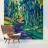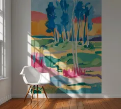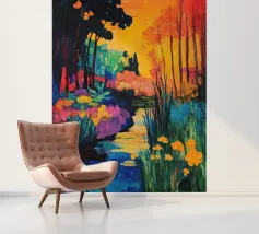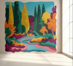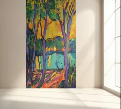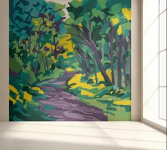An expressive, painterly landscape of a path alongside a stream flowing through a forest. The vibrant blues, greens, and yellows create a dynamic, beautiful, and slightly abstract depiction of a walk in nature.