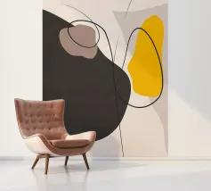 Dikke zwarte bogen en gele accenten kronkelen door de ruimte als kinetische symbolen.