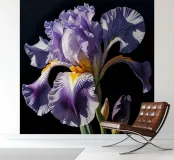 A stunning bearded iris in full bloom, captured in a close-up view against a dark background. The intricate details of the flower's ruffled petals, vibrant colors, and contrasting textures are beautifully highlighted. This exquisite artwork celebrates the beauty and elegance of nature's creations.