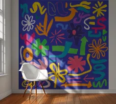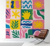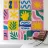 A joyful and colorful grid is filled with a variety of playful patterns and icons, including stylized flowers and abstract shapes, creating a cheerful and decorative design.