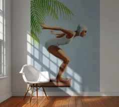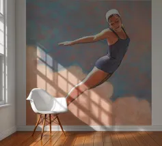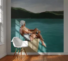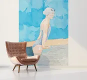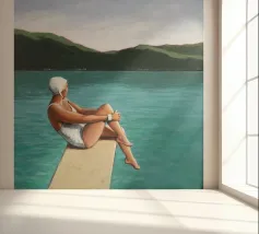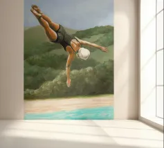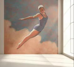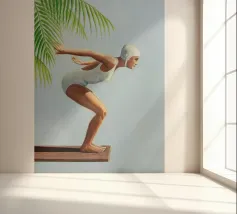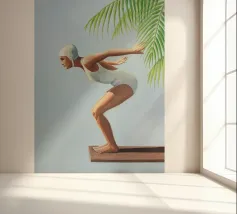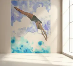 Bathed in liquid light, a lone swimmer lingers at the pool’s edge — her silhouette softened by watercolor’s gentle wash. Strength and serenity intertwine as she gazes into the blue, a quiet moment suspended between motion and memory, painted with breath and grace
