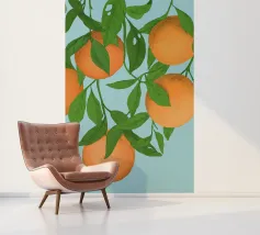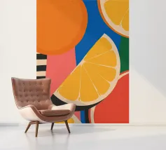 A graphic, pop art style pattern of orange slices against a dark blue background. The composition is modern, vibrant, and a fresh, zesty, and stylish design.