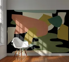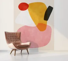 A sophisticated abstract piece with layered, semi transparent shapes in a warm palette of red, pink, and ochre, creating depth and a sense of gentle movement.
