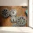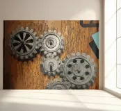 Gear of moving mechanical cogwheels fixed on a wooden panel.