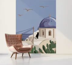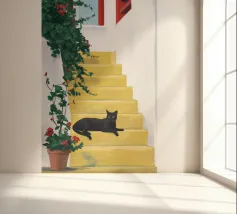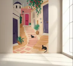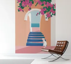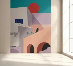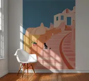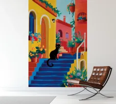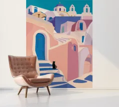 Een charmante illustratie van een zwarte kat die op de trappen van een mooie stad aan zee zit, met gebouwen in zachtroze. Het tafereel is vredig, schilderachtig en vol mediterrane charme.