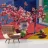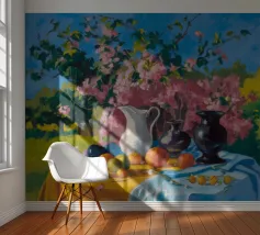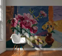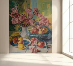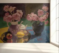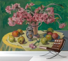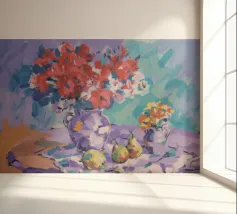 Een gedurfd stilleven met levendige roodroze bloemen, mogelijk klaprozen of geraniums, in een eenvoudige vaas, naast frisgroene peren, alles op een rijk rood tafelkleed dat scherp contrasteert met een diepblauwe achtergrond.
