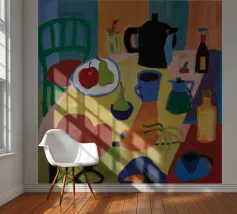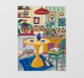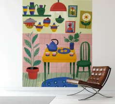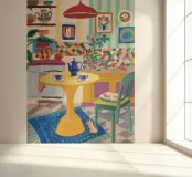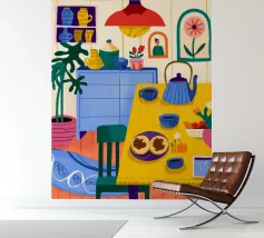 A vibrant patchwork kitchen with yellow table, tea set, and art bursts with domestic color.
