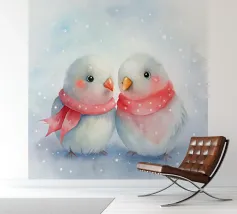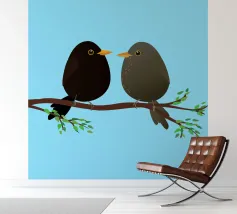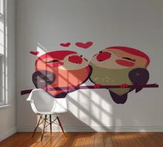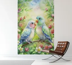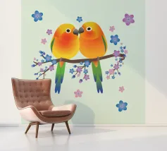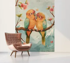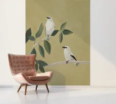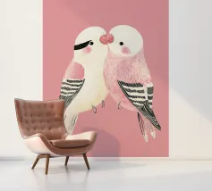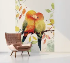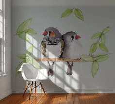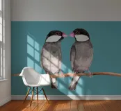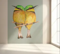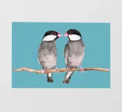 Een aquareltekening van twee Java-mussen. Ze zitten naast elkaar op een lange stok en raken elkaar aan met de punten van hun snavels.