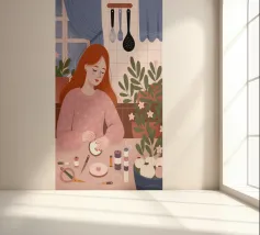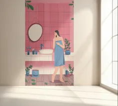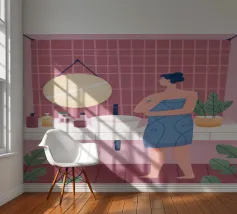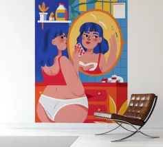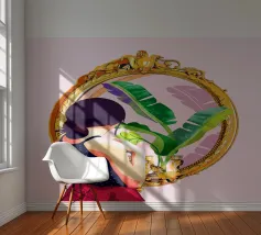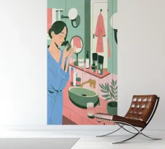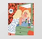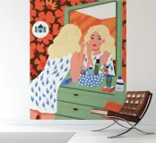 This artwork shows a person with blonde hair looking into a vanity mirror. The background is filled with floral wallpaper, and the vanity table is adorned with various items, creating a nostalgic and intimate scene.