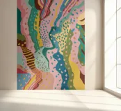 An abstract composition of flowing, wavy lines and organic shapes in a vibrant palette of green, pink, blue, and orange, creating a sense of joyful movement and rhythm.