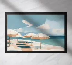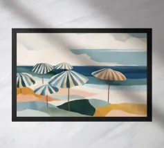 Een serene illustratie van een rustig strand, badend in warme tinten. Zonnehoeden rusten in het zand en rustieke hutten completeren het vredige tafereel, dat de essentie van langzame zomerdagen weergeeft.