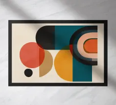 Moderne, op Bauhaus geïnspireerde poster in krachtige kleuren en heldere vormen. Combineert strenge geometrie met zachte rondingen - een tijdloos designstatement voor woon- en werkruimtes.