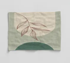 Een bladtak overlapt met geometrische vormen, waaronder gebogen lijnen en gelaagde, gedempte tinten. De combinatie creëert een harmonieuze mix van natuur en abstract ontwerp.