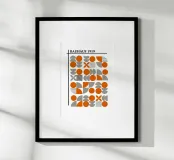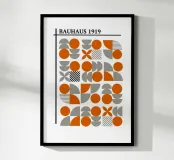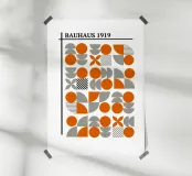 Een visueel rijke, op Bauhaus geïnspireerde abstracte poster uit 1919 met een ingewikkeld geometrisch mozaïek. Het patroon is opgebouwd uit in elkaar grijpende halve cirkels, volledige cirkels en kwartcirkels in een gedurfd palet van verbrand oranje/terracotta en koel slagschipgrijs. Subtiele details, zoals kleine vierkantjes met zwarte en witte strepen of stervormige motieven, voegen complexiteit toe. Het ontwerp is strak gecomponeerd op een schone witte achtergrond, bovenaan en links omlijst door vette zwarte lijnen en de tekst "BAUHAUS 1919". Deze digitale afdruk met hoge resolutie (7000 x 5000 pixels, 300 dpi) biedt een superieure helderheid en legt het de