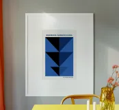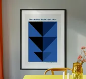 Een krachtige en minimalistische geometrische abstractie die de geest van de Bauhaus-beweging (1919-1923) perfect weergeeft. De compositie is opgebouwd uit eenvoudige, in elkaar grijpende drie- en vierhoeken, waarbij gebruik is gemaakt van een scherp, contrastrijk palet van levendig kobaltblauw, gedurfd zwart en puur wit. Het samenspel van vormen en blauwtinten creëert een gevoel van diepte en dynamische beweging en transformeert fundamentele geometrie in meeslepende moderne kunst. Deze klassieke Bauhaus-posterstijl benadrukt vorm en functie, waardoor het een elegant middelpunt is voor elk hedendaags, middeleeuws of industrieel interieur.