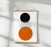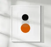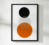 Een opvallende, op Bauhaus geïnspireerde abstracte poster met een strakke, verticale stapeling van drie grote cirkels. De bovenste cirkel is effen zwart, de onderste is fel oranje/terracotta. Het middelste deel, dat de overlapping voorstelt, is een schone cirkel met een patroon van diagonale grijze strepen, dat lichtjes doorloopt in de oranje bol eronder. Dit ontwerp is een prachtige studie in kleur, patroon en geometrische overlapping en belichaamt perfect het modernistische principe van vorm en contrast. Deze digitale afdruk met hoge resolutie (7000 x 5000 pixels, 300 dpi) zorgt voor scherpe lijnen en levendige kleurblokken, waardoor het een elega