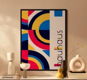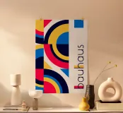 Een levendige en dynamische poster in Bauhaus-stijl met het iconische primaire kleurenpalet van rood, blauw en geel, samen met diep marineblauw en wit. De linkerkant heeft een dicht, zich herhalend geometrisch patroon van in elkaar grijpende bogen, cirkels en driehoeken, waardoor een complex, ritmisch mozaïek ontstaat. De rechterkant is minimalistisch wit met een verticale "Bauhaus" inscriptie en een klein blauw vierkant bovenaan. Dit digitale posterbestand (7000x5000 pixels, 300 dpi) biedt uitzonderlijke helderheid en kleurenrijkdom voor een hoogwaardige afdruk van museumkwaliteit.