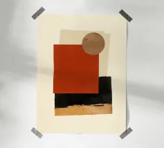 Minimalistische illustratie met vazen, schalen en geometrische vormen in een strakke vierkante compositie. De natuurlijke beige en aardse tinten maken het een veelzijdige print voor moderne, scandinavische of boho interieurs.