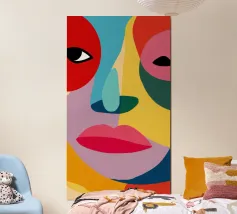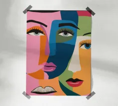 Een op kubisme geïnspireerd kunstwerk met meerdere overlappende en gefragmenteerde gezichten. De gedurfde lijnen en het levendige kleurenpalet creëren een dynamische en expressieve compositie die verschillende facetten van identiteit verkent.