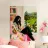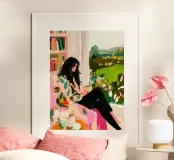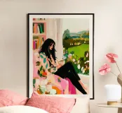 Deze prachtige digitale poster legt een moment van intieme zelfzorg en rust vast. Een vrouw met donker haar zit comfortabel bij een groot raam en geniet van een kopje koffie waarvan de stoom zachtjes opstijgt. Het rijke penseelwerk in impasto-stijl maakt gebruik van levendige, expressieve kleuren, met name fel roze, diep groen en wit, waardoor een luxe, texturale uitstraling ontstaat. De achtergrond is verdeeld tussen een kleurrijke, volle boekenplank en een helder, glooiend groen landschap. Deze digitale download van hoge kwaliteit (7000x5000 pixels, 300 dpi) biedt superieure artistieke details en is perfect voor het toevoegen van een esthetische, eigentijdse t