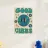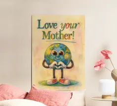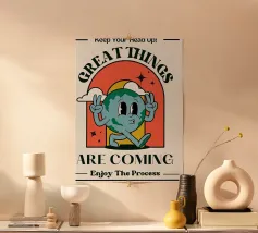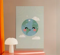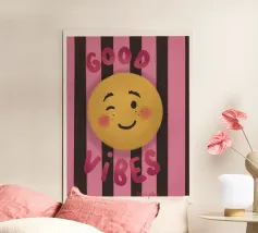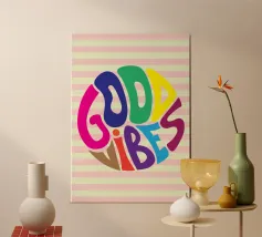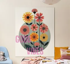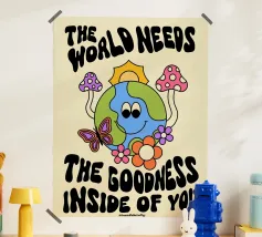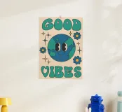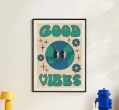 Deze vrolijke en milieubewuste poster heeft een vriendelijke, lachende aarde met grote ogen, weergegeven in een speelse, gestructureerde stijl met blauwe en groene tinten. De woorden "GOOD" bovenaan en "VIBES" onderaan zijn geschreven in een golvend, retro groenblauw lettertype dat de hoofdillustratie perfect aanvult. Het ontwerp wordt geaccentueerd met grillige blauwe bloemen en fonkelende sterrensprongen tegen een subtiele, gespikkelde perzikkleurige achtergrond. Deze digitale poster van hoge kwaliteit (7000x5000 pixels, 300 dpi) zorgt voor uitzonderlijke details en levendige kleurenreproductie, waardoor het een perfect stuk is voor het verspreiden van positivit