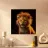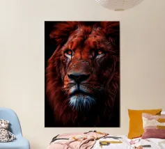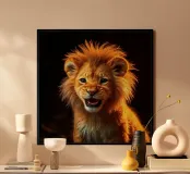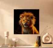 Een jong leeuwenwelpje toont zijn opvallende manen en alerte uitdrukking tegen een donkere achtergrond. De belichting accentueert zijn vacht en creëert een betoverende sfeer.