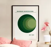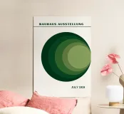 Een prachtige abstracte print die een eerbetoon is aan de kleurtheorie-experimenten van Wassily Kandinsky tijdens de Bauhaus-beweging (1919). Het ontwerp bestaat uit een grote, uit het midden geplaatste concentrische cirkel met vier verschillende monochrome groentinten die naadloos overgaan van diep bosgroen naar een bleke, mistige salie. De minimale vorm richt zich volledig op de optische effecten en emotionele impact van kleurgradatie, een kernprincipe van de vroege abstracte kunst. De eenvoudige typografie "BAUHAUS AUSSTELLUNG JULY 1919" plaatst het werk in zijn historische tentoonstellingscontext. Dit digitale meesterwerk in hoge resolutie