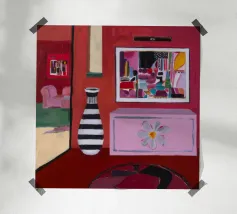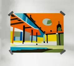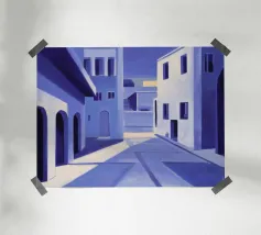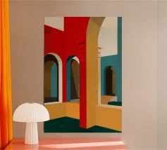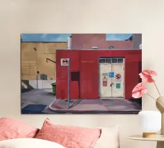De grimmige geometrie van een overdekte wandelgang wordt gedefinieerd door krachtige karmozijnrode pilaren en de lange, scherpe schaduwen die ze werpen in het felle zonlicht. Dit schilderij is een krachtige studie van licht, schaduw, kleur en architectonische vorm.