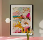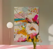 Deze levendige digitale poster toont een verbluffende reeks expressieve bloemen weergegeven in een gedurfde, impasto stijl. Grote, schilderachtige bloemen in roomwitte, warmroze en zachtroze tinten domineren de voorgrond, geaccentueerd door tere takjes gipskruid. De achtergrond is voorzien van dynamische, abstracte penseelstreken in warme geeltinten, rijke sinaasappels, sereen blauw en zacht roze, waardoor een gevoel van beweging en energie ontstaat. Dit digitale kunstwerk in hoge resolutie (7000 x 5000 pixels, 300 dpi) biedt een rijke, texturale uitstraling, waardoor het een perfect statement is voor elk modern of eclectisch interieur.