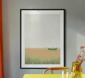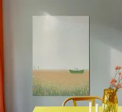 Dit rustige, minimalistische digitale kunstwerk vangt een scène van vredige eenzaamheid. De compositie toont een eenzame visser in een groene boot die over het water glijdt, weergegeven in zachte oranje en perzikkleuren. De voorgrond wordt gedefinieerd door gedetailleerde wilde grassen en oranje bloemen, die een duidelijk contrast vormen met de uitgestrekte, luchtige, gebroken witte achtergrond. Een kleine zwerm rode vogels vliegt door de open lucht en voegt een vleugje leven toe. Deze hoogwaardige digitale poster (7000x5000 pixels, 300 dpi) biedt een rustgevende, Japans geïnspireerde esthetiek die perfect is voor moderne, serene ruimtes.