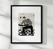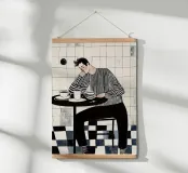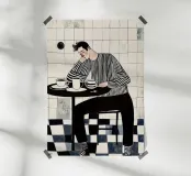 Deze suggestieve illustratie vangt een rustig moment in een koffieshop, weergegeven in een geraffineerd monochroom palet met subtiele vleugjes warmte. Een man met donker haar, gekleed in een opvallend gestreept overhemd en zwarte broek, zit peinzend aan een kleine ronde tafel, zijn hoofd rustend op zijn hand. Naast hem suggereren meerdere koffiekopjes een slepende aanwezigheid. De achtergrond bestaat uit een betegelde muur met textuur en een dambordvloer, wat diepte en visuele interesse toevoegt. Dit werk belichaamt perfect een gezellige maar introspectieve koffieshop-esthetiek, waarbij een tijdloze stijl wordt gecombineerd met moderne kunstgevoeligheden.
