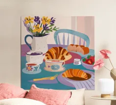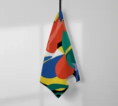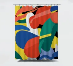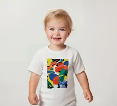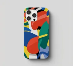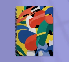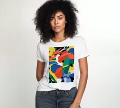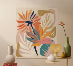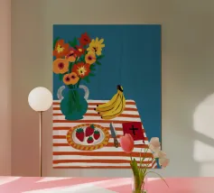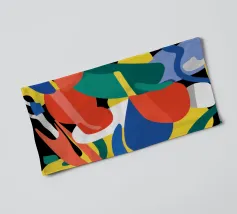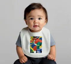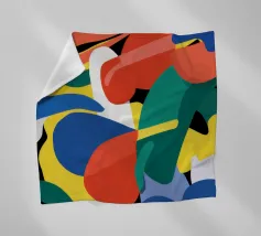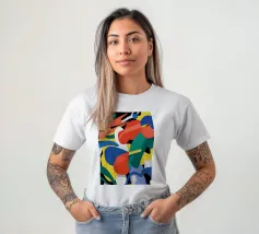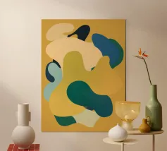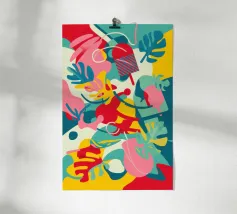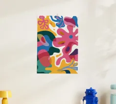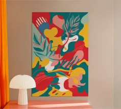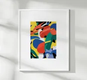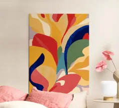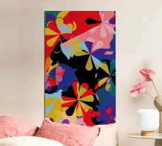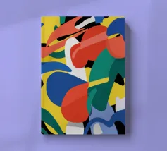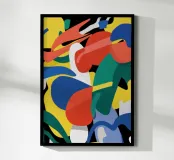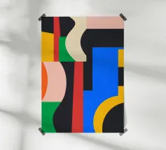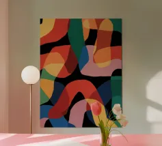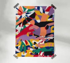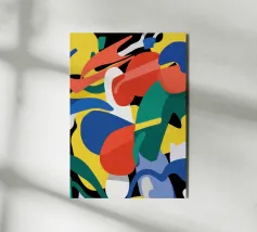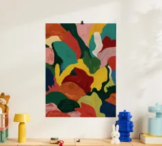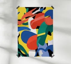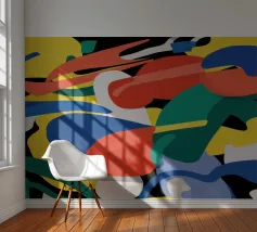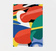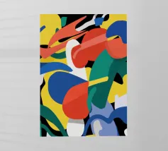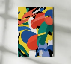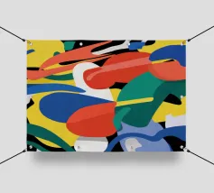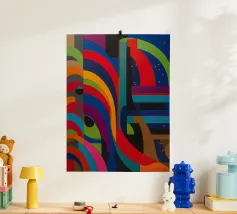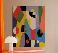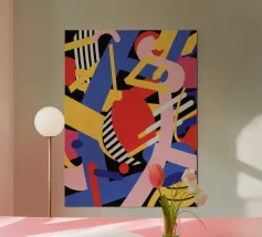 Een energiek abstract kunstwerk waarin gedurfde vormen in de primaire kleuren rood, blauw en geel botsen en elkaar overlappen. De compositie is dynamisch en speels, met een sterke grafische impact die doet denken aan moderne meesters.