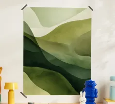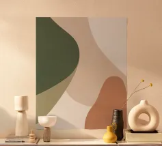 Minimaal abstract kunstwerk met vloeiende gelaagde vormen in saliegroen, zand- en crèmetinten. Zachte, vloeiende compositie voor kalme hedendaagse interieurs.