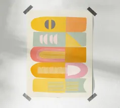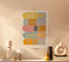 Deze moderne poster combineert drie rechtopstaande, gekleurde balken met een gebogen lijn die zich door het beeld slingert. De heldere geometrie ontmoet organische beweging, de kleuren - roze, oranje, geel en paars - creëren diepte en energie. Ideaal voor creatieve kamers, moderne woonconcepten en designliefhebbers die heldere vorm en lichtheid willen combineren.
