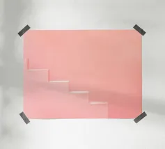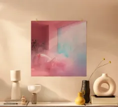 Zachtroze interieur met zonlicht dat schaduwen werpt in een dromerige hahnemühle