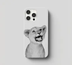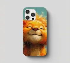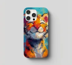 Een jong leeuwenwelpje grijnst breed en laat zijn speelse aard zien. De gouden vacht en heldere ogen van het welpje steken af tegen een donkere, kleurrijke achtergrond en creëren een levendige sfeer vol vreugde.