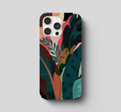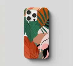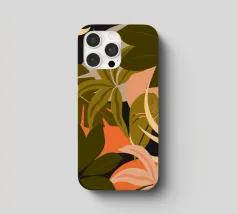 Een elegante en stemmige compositie van donkere, overlappende tropische bladeren met vleugjes oranje en wit, waardoor een geraffineerd en dramatisch spel van schaduw en licht ontstaat.