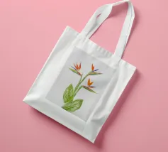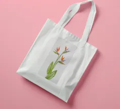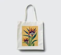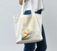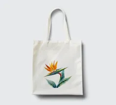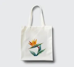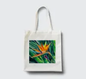 Dit schilderij toont een paradijsvogelbloem in volle bloei, waarbij de fel oranje en blauwe bloemblaadjes afsteken tegen de groene bladeren. De levendige kleuren en ingewikkelde details benadrukken de exotische schoonheid van de bloem.