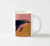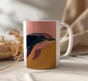 Een eenvoudige weergave van een dolfijn in warme roze en okertinten, met een kalme en evenwichtige aanwezigheid.