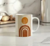 Breng warmte en evenwicht in je ruimte met dit abstracte geometrische kunstwerk met een zon- en boogontwerp in aardetinten. De minimalistische retro-esthetiek voegt een tijdloze, rustgevende touch toe aan elk interieur. Perfect voor een moderne, bohemien of Scandinavisch geïnspireerde inrichting.