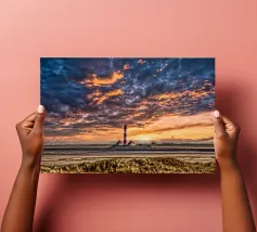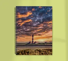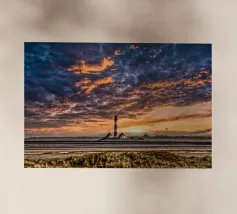 Vuurtoren en duinen is een digitaal kunstwerk dat werd gerealiseerd als een digitale afdruk van hoge kwaliteit. De computergraphics combineren heldere vormen en zachte kleurovergangen om een gestileerde weergave van het Noord-Duitse kustlandschap te creëren. In het midden staat een vuurtoren, omringd door zacht gemodelleerde duinen en een uitgestrekte lucht - een iconisch motief dat hier opnieuw wordt geïnterpreteerd. De digitale realisatie geeft het beeld een kalm, bijna meditatief aura. Kleuren en vormen zijn gereduceerd, maar toch precies en sfeervol.
