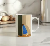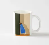 Deze expressieve poster toont een vrouw in een blauwe jas die met haar hoofd tegen een muur leunt - een rustig symbool van overbelasting, bedachtzaamheid of gewoon een van die dagen. Het heldere, minimalistische kleurenpalet in beige, oker en middernachtblauw creëert een sterke grafische compositie met emotionele diepte.