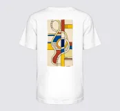 Dit zeer abstracte wandtapijt van Fernand Léger toont zijn karakteristieke gebruik van sterke zwarte contouren en gedurfde primaire en secundaire kleuren. De compositie wordt gekenmerkt door dikke, kronkelende vormen die doen denken aan een diskantlijn of muzieknotatie, afgezet tegen blokken kleur en witte baksteenachtige patronen. Het werk weerspiegelt Légers levenslange verkenning van pure vorm en kleur.
