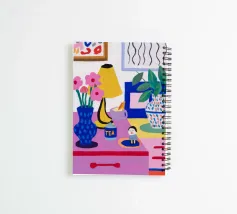 A quirky desk with pink lamp, vase flowers, matryoshka, and tea brings playful personality.