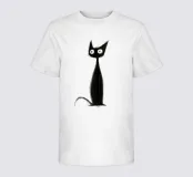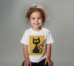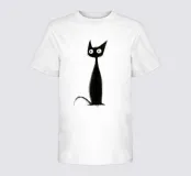 Een minimalistische zwart-wit illustratie van een slanke, zwarte kat met overdreven wijde ogen en schetsmatige trekken. Het grillige en abstracte ontwerp van de kat voegt een speels, artistiek tintje toe.